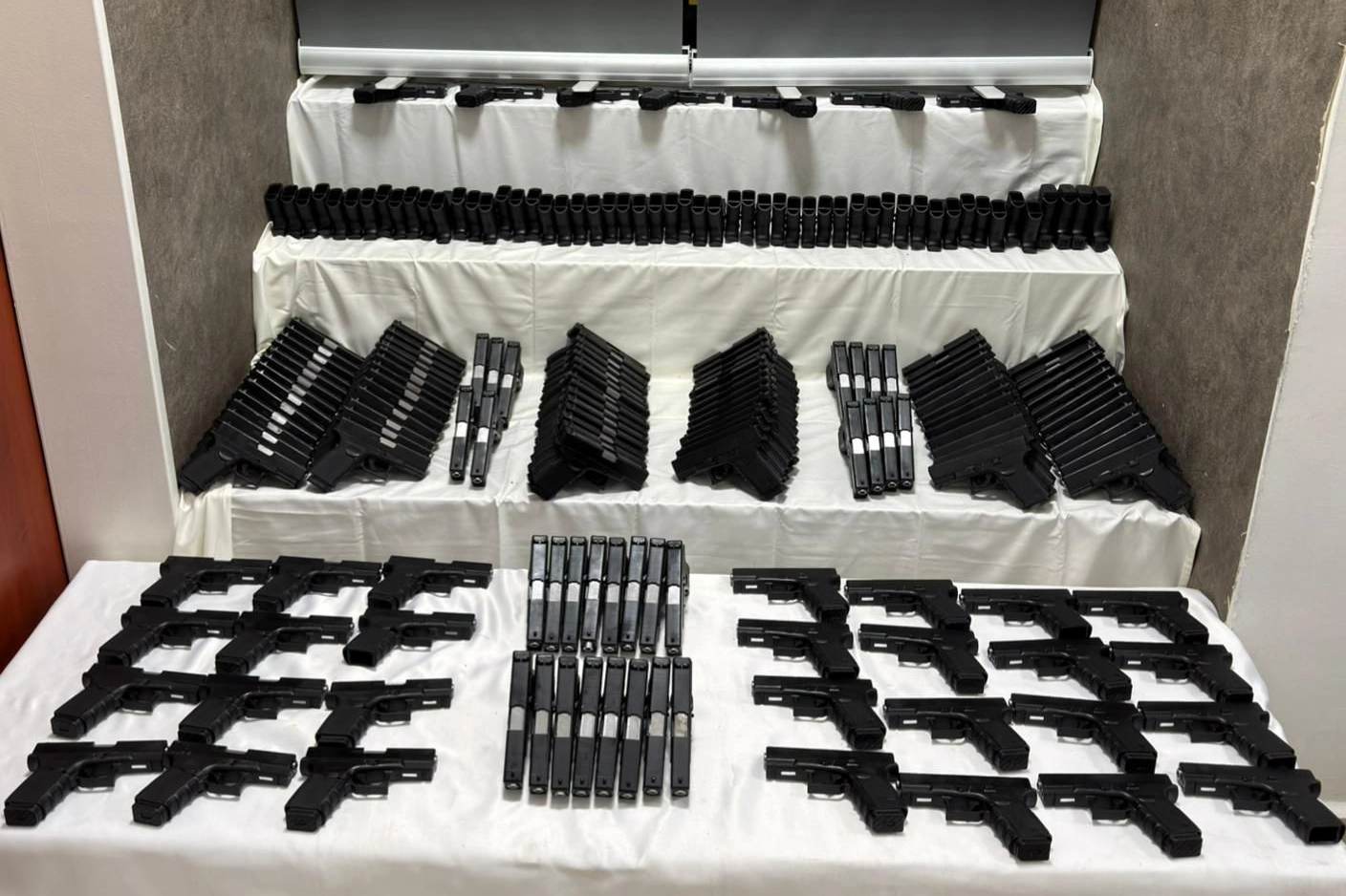 Adreste yapılan aramalarda, 149 ruhsatsız tabanca, 77 tabanca gövdesi, 38 icra yayı ile bir miktar esrar ele geçirildi.