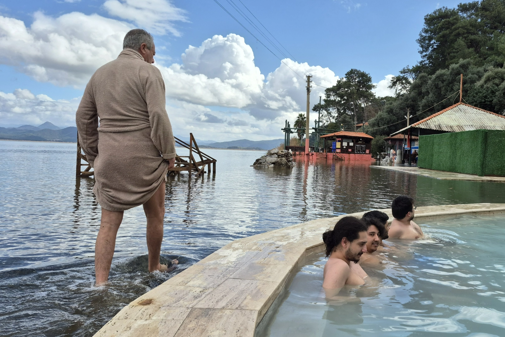 Bazı vatandaşlar, gölden taşan suların altında kalan kaplıcalarda suya girdi.