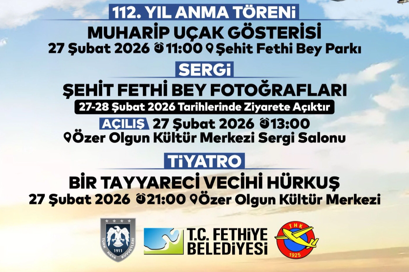 Fethiye Belediyesi tarafından organize edilen anma programı, 27 Şubat 2026 Cuma günü saat 11.00’de Şehit Fethi Bey Parkı’nda gerçekleştirilecek. Program kapsamında muharip uçak gösterisi düzenlenecek.