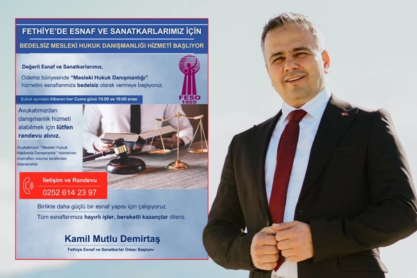 Fethiye Esnaf ve Sanatkârlar Odası, üyelerinin karşılaştığı hukuki konularda destek alabilmesi amacıyla ücretsiz hukuk danışmanlığı hizmetini başlatıyor. Oda tarafından yapılan bilgilendirmeye göre uygulama, Şubat ayı itibarıyla yürürlüğe girecek ve esnafa herhangi bir ücret yansıtılmadan sunulacak.