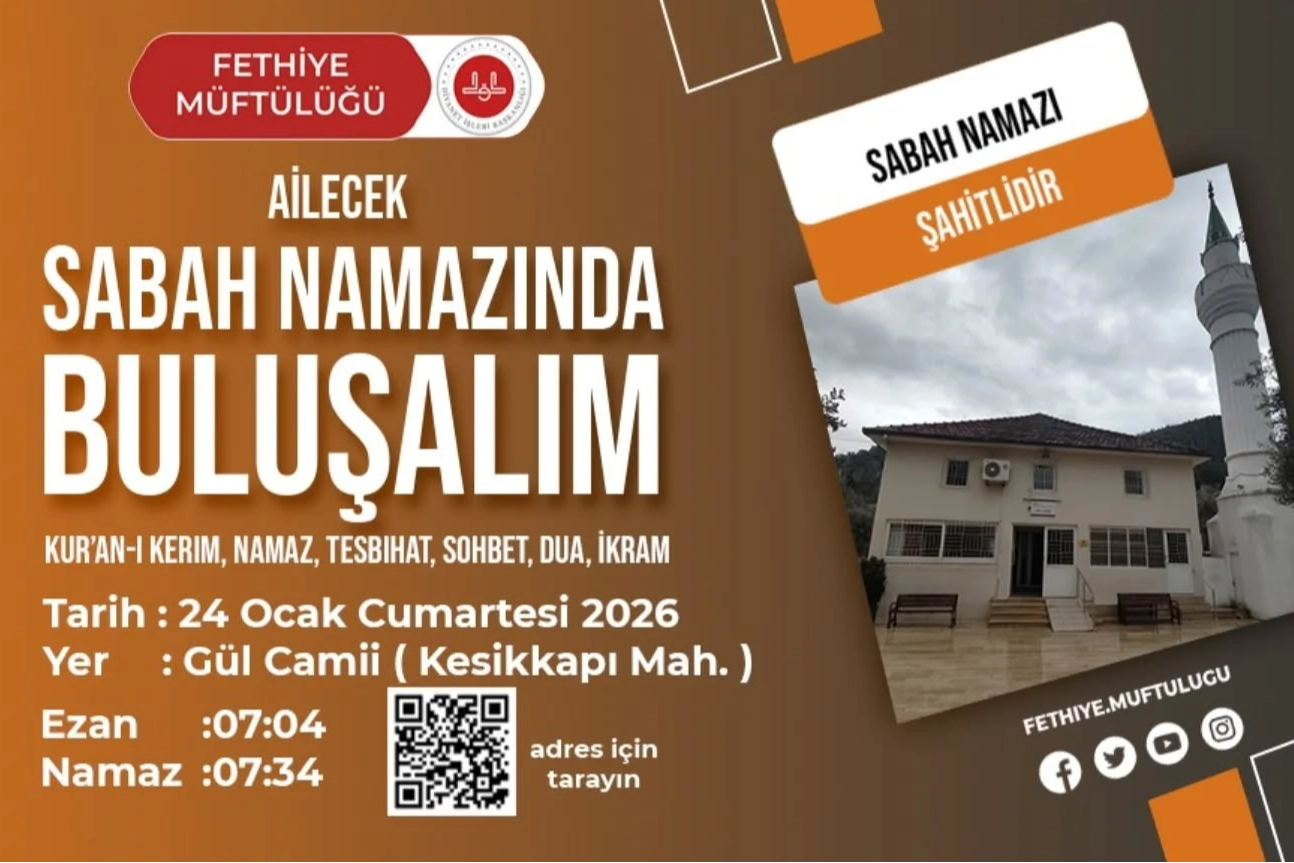 Fethiye Müftülüğü tarafından “Ailecek Sabah Namazında Buluşalım” programı düzenlenecek. Sabah namazının önemine dikkat çekmek amacıyla gerçekleştirilecek programda vatandaşlar bir araya gelecek.