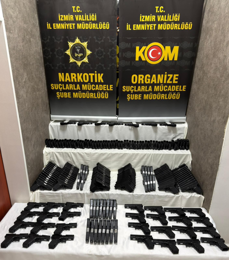İzmir'in Karabağlar ilçesinde düzenlenen helikopter destekli operasyonda, 149 ruhsatsız tabanca ile çok sayıda silah parçası ve bir miktar esrar ele geçirildi.
