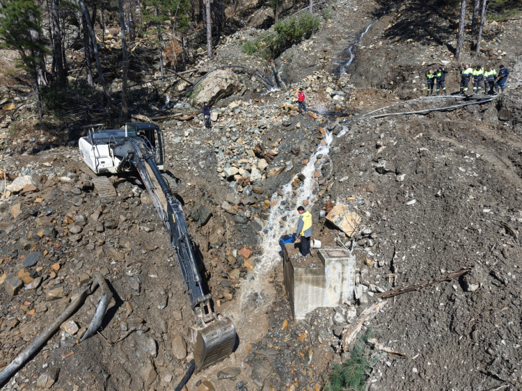 Drone destekli havadan yapılan tespitlerle yüzey ve alan analizi sağlanarak müdahale süreci hızlandırıldı. Yoğun yağışların etkisini sürdürmesiyle bölgede zaman zaman yeni toprak kaymaları yaşanmasına rağmen, depolara su iletiminin sağlanması ve sürekliliğin korunması amacıyla çalışmalar titizlikle tamamlandı.