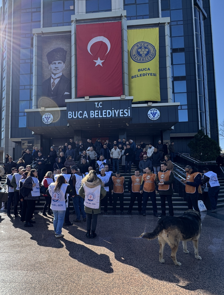 Buca Belediyesi önünde toplanan memurlar, hakları ödenmediği için 18 Şubat'ta başlattıkları kısa süreli iş bırakma eylemlerine devam etti.