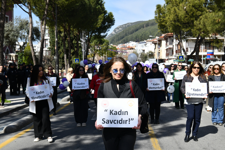 Muğla Şiddet Önleme ve İzleme Merkezi koordinasyonunda düzenlenen etkinlikte kamuda görev yapan kadın belediye başkanı, hakim, savcı, avukat, doktor, öğretmen ve idareciler meslek kıyafetleriyle yürüyüşe katıldı.