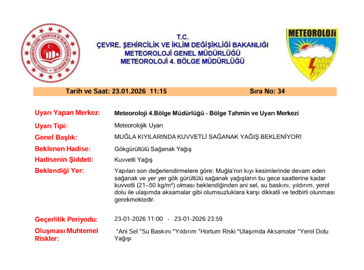 Meteoroloji, Muğla kıyılarında kuvvetli sağanak yağış uyarısı yaptı. 23 Ocak 2026'da akşam saatlerine kadar sürecek yağışlar nedeniyle sel, su baskını ve ulaşımda aksamalar bekleniyor. Vatandaşların dikkatli ve tedbirli olması istendi.