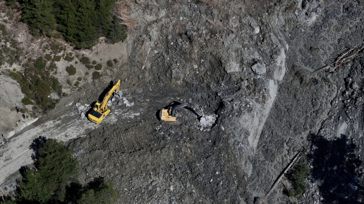 Muğla'nın Seydikemer ilçesinde iki mahalleyi birbirine bağlayan yolun ulaşıma kapanmasına neden olan heyelan havadan görüntülendi.