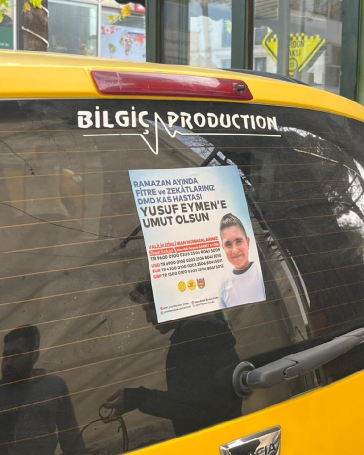 Fethiye’de taksici esnafı, DMD kas hastası Yusuf Eymen için başlatılan bağış kampanyasına destek olmak amacıyla araçlarının camlarına afişler yapıştırarak farkındalık oluşturdu.